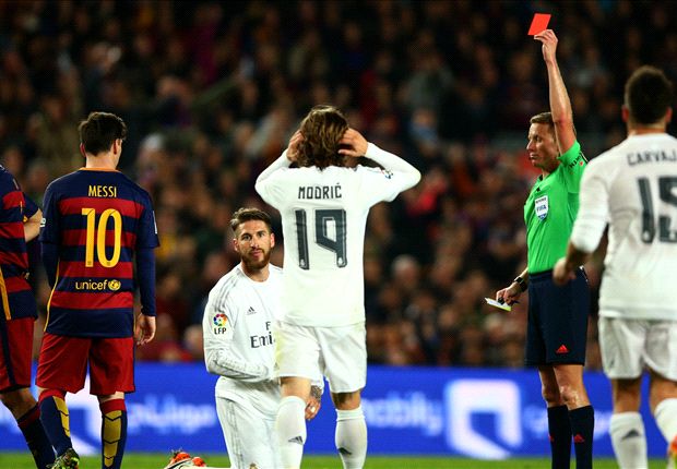 Ramos received his second yellow card when he dived in on Luis Suarez, but third-placed Madrid were not to be denied as Cristiano Ronaldo scored the match winner just two minutes later after Karim Benzema had cancelled out Gerard Pique's 56th-minute opener.